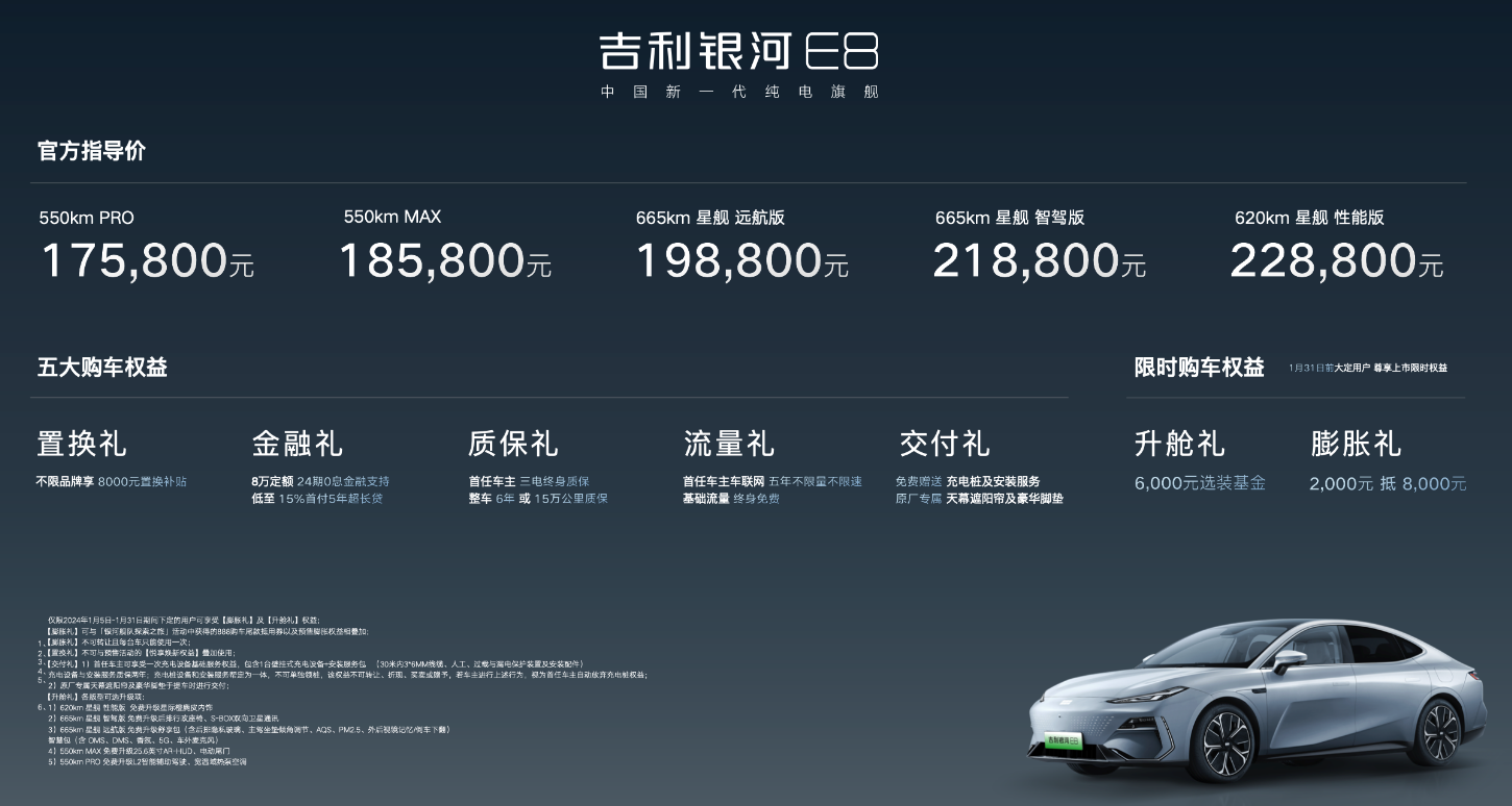 又到春节前购车热潮,基于SEA架构打造的5米宽体纯电轿车——吉利银河E8吸引了很多用户的目光,堪称过年必看、最值得入手的B级车。银河E8共推出5个版型,续航分别达到了550km、620km 、665km,售价区间17.58万元-22.88万元。五大版型该如何选择呢?今天,小编就结合不同版型的具体配置,为大家介绍下吉利银河E8该如何选购。