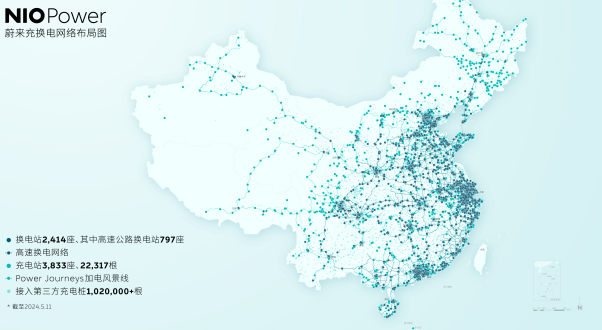 截至5月10日,蔚来已在全国范围内布局超2,414座换电站、2,252座超充站、1987座充电站,接入第三方充电桩超1,020,000根。