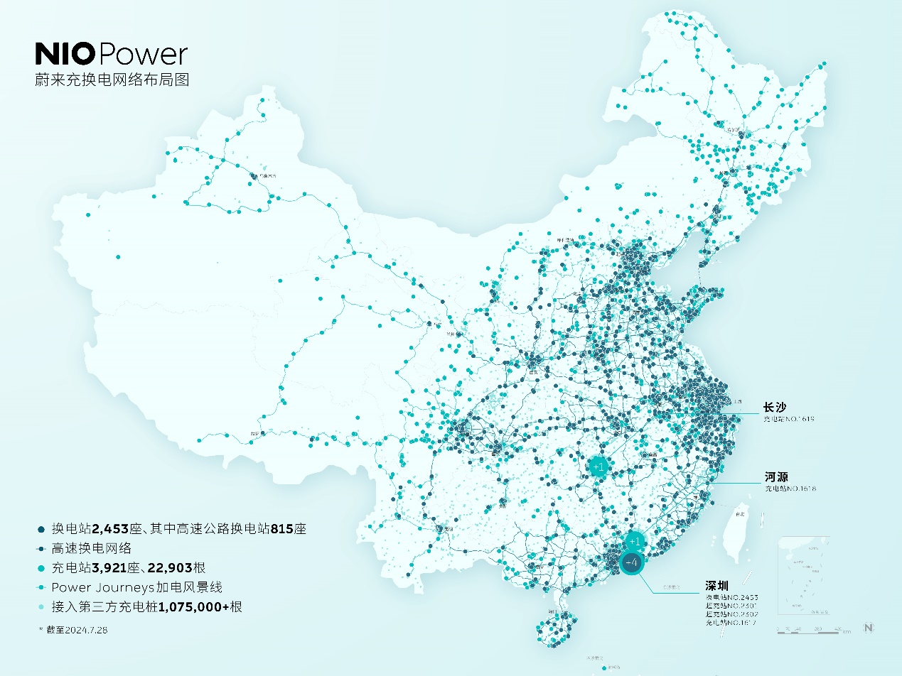 截至7月28日,蔚来已在全国建设换电站2,453座,其中高速公路换电站815座,充电站3,921座、充电桩22,903根,接入超1,075,000根第三方充电桩,布局的补能设施在全国汽车品牌中居于前列。