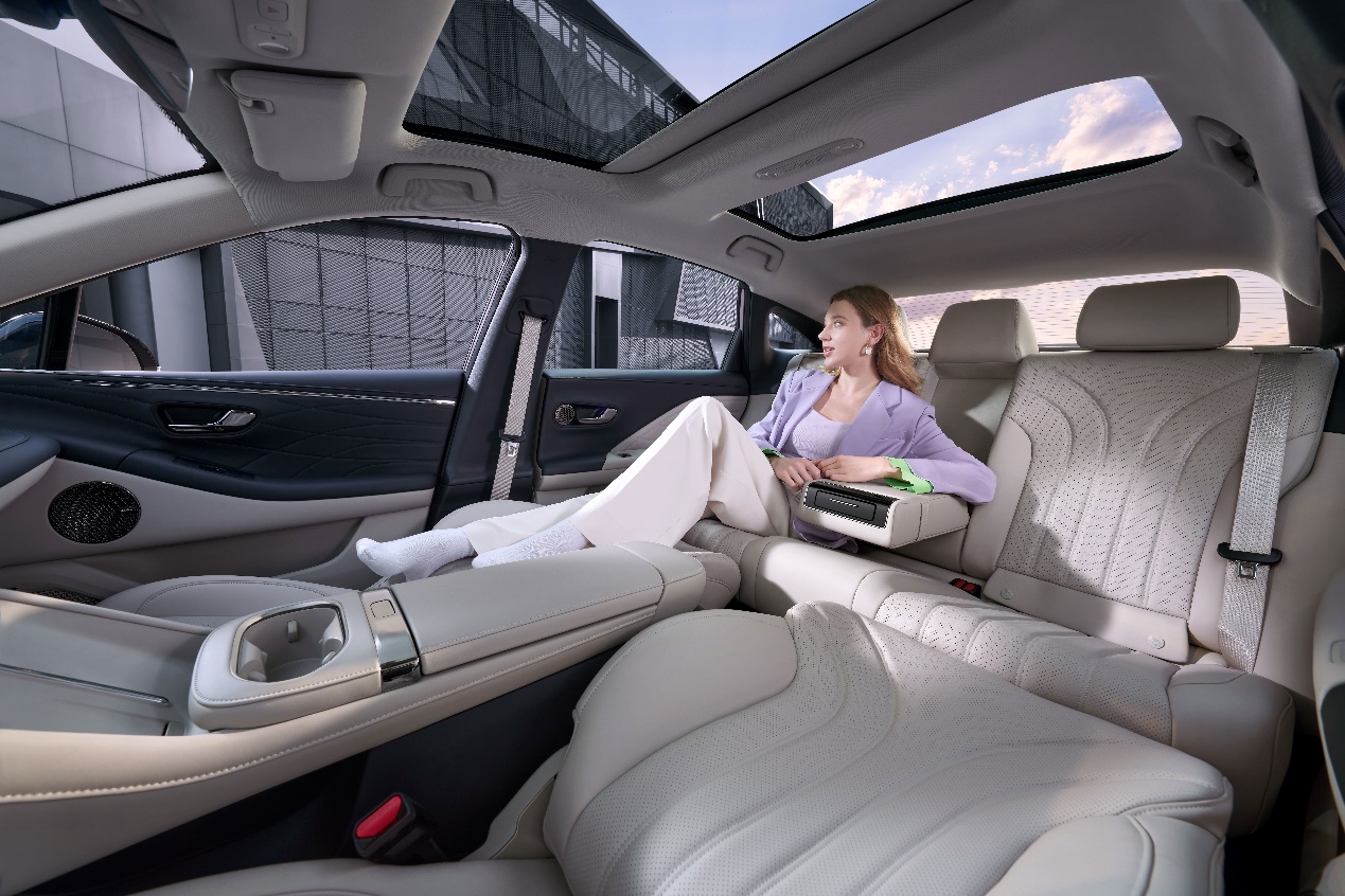 针对女性用户, AION RT也做了很多友好设计。在女性用户最看重的防晒上,AION RT配备了2块百万级豪车都罕见的电动遮阳帘,实现紫外线100%隔绝。遮阳帘巧妙放置在车顶横梁两侧隐秘空间内,独有的超小型电机,不影响头部空间。此外,AION RT还配备同级首个全景双天幕,前排防晒,后排观景,皆大欢喜。
